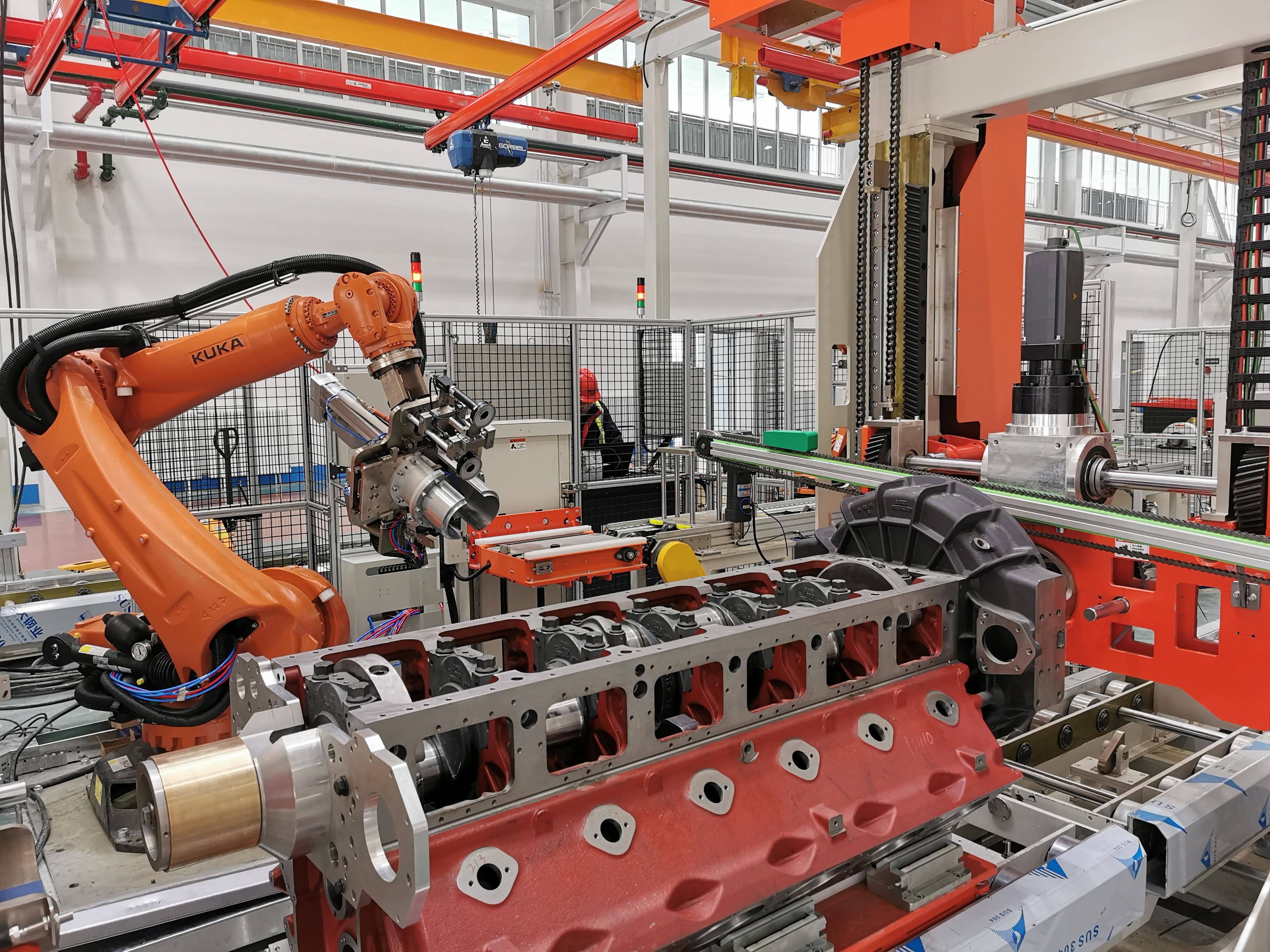 多機(jī)型共線柔性自動化裝配線,實現(xiàn)發(fā)動機(jī)機(jī)體裝配。包含:重載摩擦滾輪輸送線主軸承蓋、連桿螺栓擰緊機(jī)活塞連桿自動入缸設(shè)備盤車機(jī)構(gòu)前端蓋涂膠機(jī)大型龍門式翻轉(zhuǎn)機(jī)缸蓋分裝線、活塞連桿分裝線等。